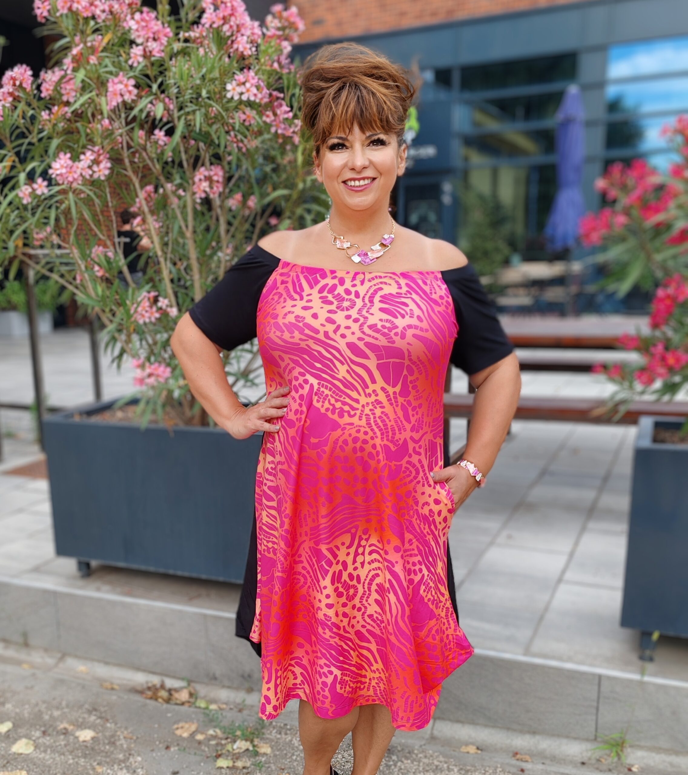 Nyári ruha pink mintával, hátulja fekete viszkózból.